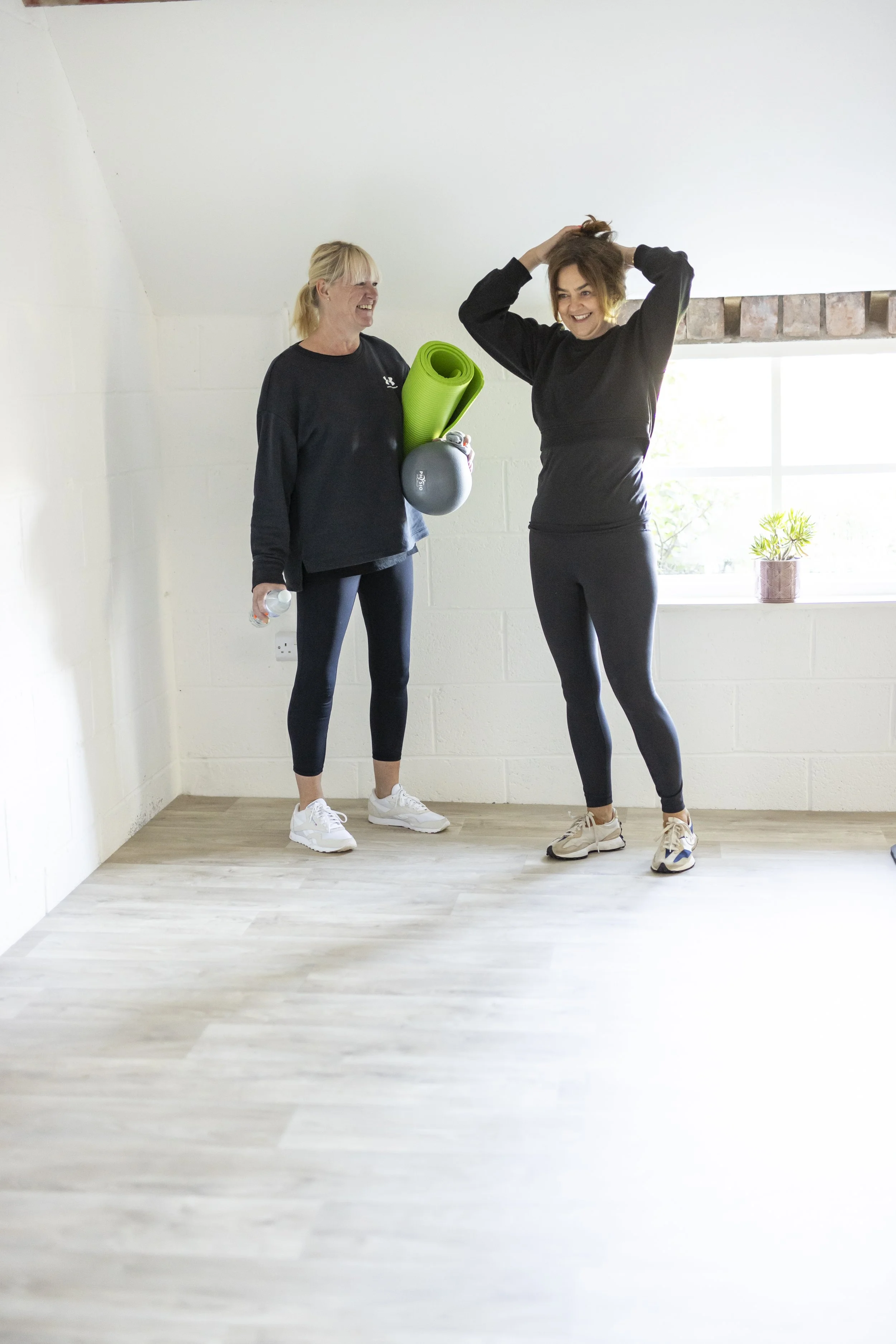 A smile and a willingness to enjoy the movement. All equipment provided in the studio or if you are zooming from home then you will need mat, a flex band, and a pilates soft ball.